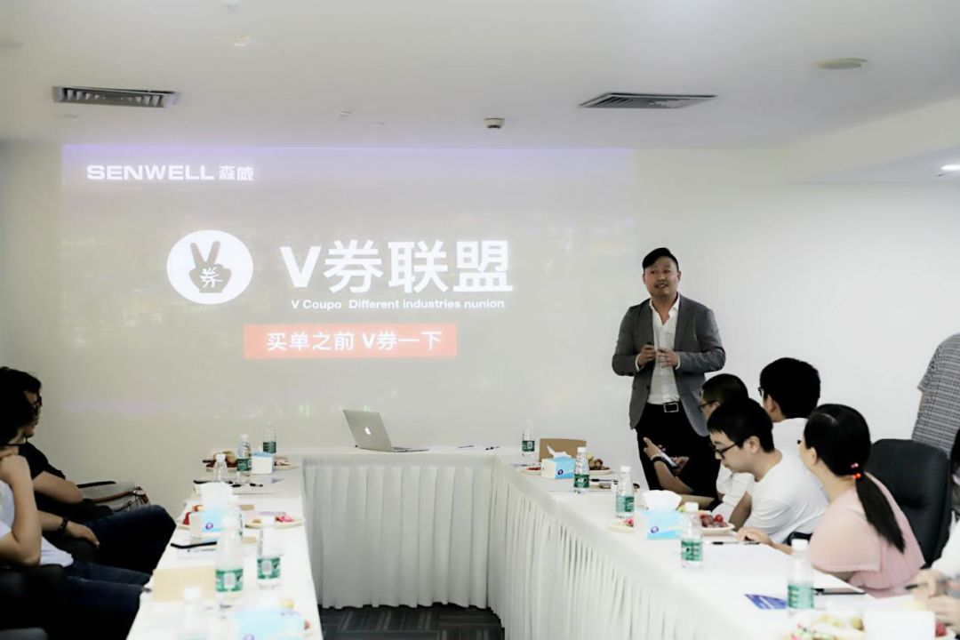 森威&广州道讯总经理谢继宏介绍V券是一款提供用户获取、留存及变现的引流神器,将各品牌会员积分转换成现金流通,用积分购买生活必需品,通过异业线上线下相互发券实现引流。