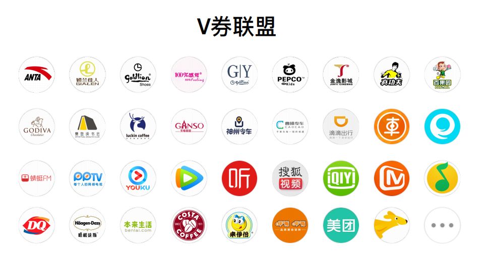 目前,安踏×娇兰佳人×金利来皮鞋×百分百感觉内衣×金利来GY时尚休闲×小猪班纳×真功夫×百果园……等品牌已经进驻V券。